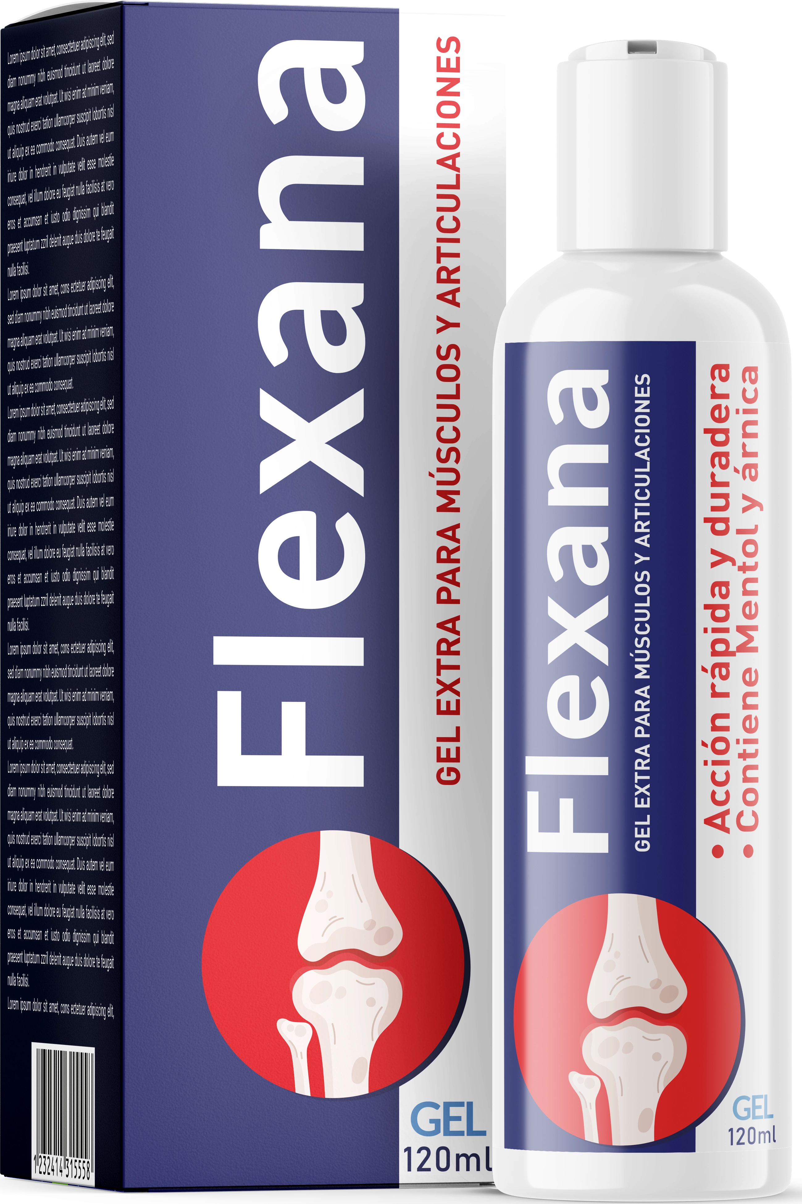 Aplicar una pequeña cantidad de gel Flexana sobre la piel limpia en la zona afectada.